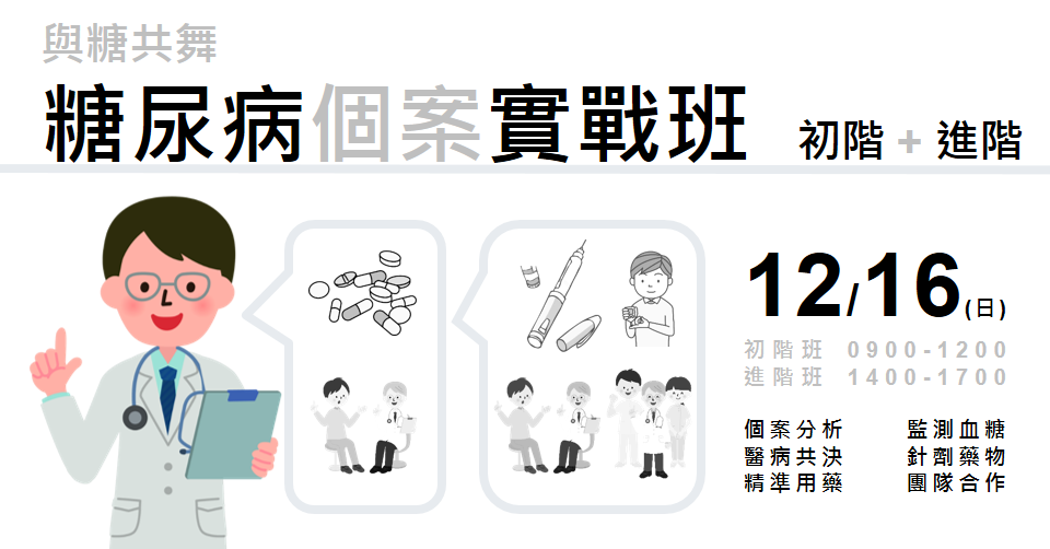 進階班:糖尿病針劑藥(基礎胰島素、腸泌素、pre-mix胰島素)的用藥和勸進經驗、用藥衛教、個案實戰、綜合討論;測血糖勸進和工具;營養諮商勸進和實例